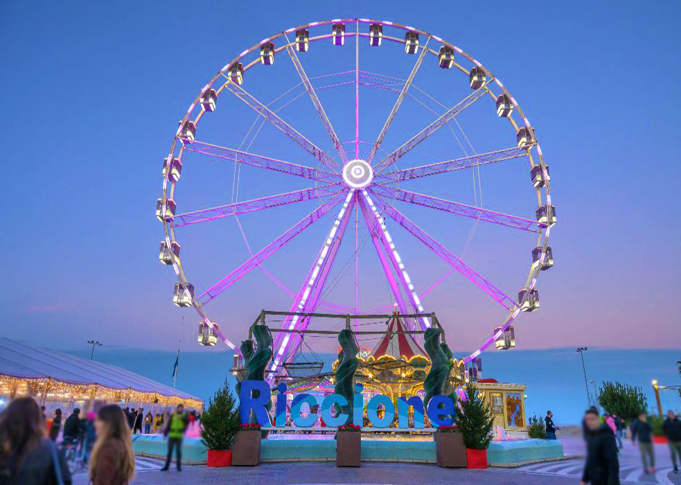 La luminosità di Riccione, tra ruota panoramica, passeggiate sul lungomare e l’eleganza dell’Atlantic illuminato a festa.